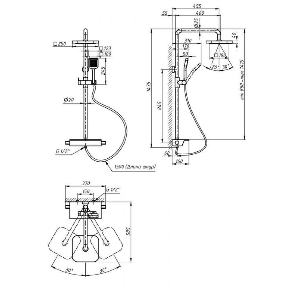 - Ручной душ: 123х123. Верхний душ: 250х250.