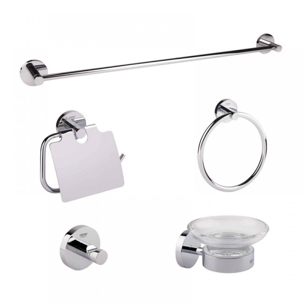 - Набор аксессуаров Grohe Essentials 40344001 - это все, что нужно для создания стильного и гармоничного дизайна ванной комнаты. Набор включает в себя полотенцедержатель-кольцо (40365001), полотенцедержатель-перекладину (40366001), крючок для одежды (40364001), держатель туалетной бумаги с крышкой (40367001), мыльницу с держателем (40444001). Каждая деталь покрыта прочным, долговечным и легким в уходе хромированным покрытием GROHE StarLight.