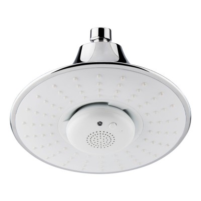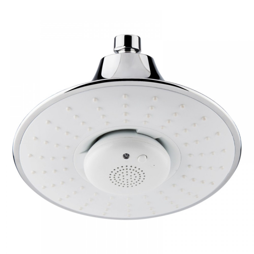 Лейка для верхнего душа Q-tap 0040 WHI выполнена из пластика с хромированным покрытием, поэтому поверхность блестящая, не ржавеет, не боится гидроударов и перепада температур, а также не облезает от агрессивных моющих. К преимуществам следует также отнести большую рабочую поверхность струи с 88 резиновыми форсунками, которая окутает вас водой. На внутренней съёмной рабочей поверхности диаметром 80 мм расположен динамик с кнопкой включения-выключения и BLUETOOTH.