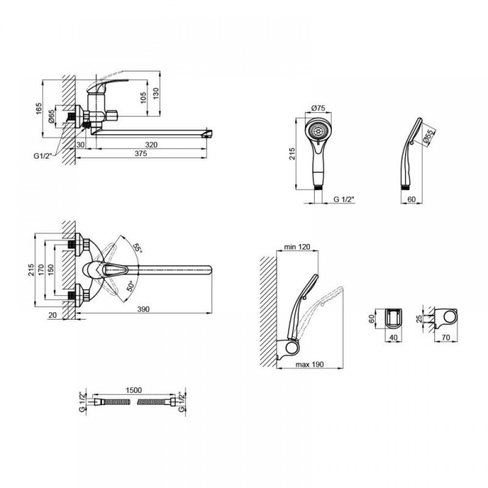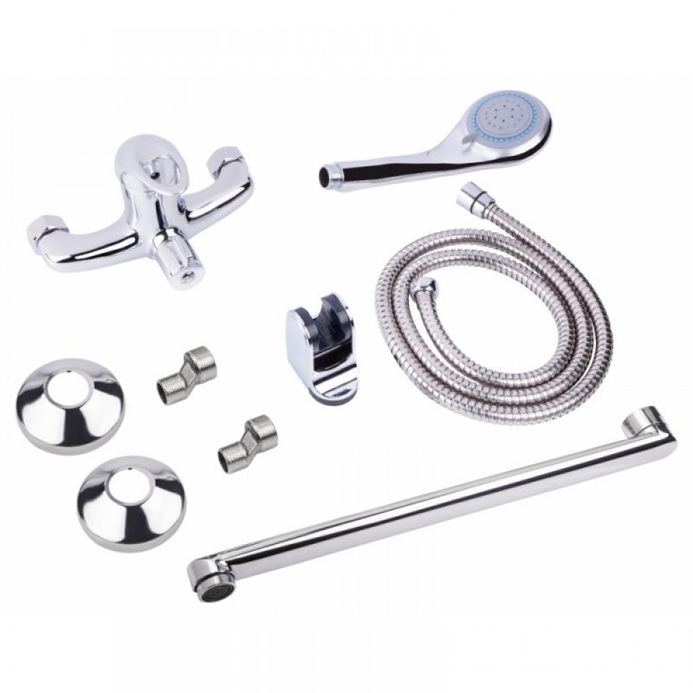 - Смеситель, душевой шланг, лейка для ручного душа, держатель для ручного душа, крепежи