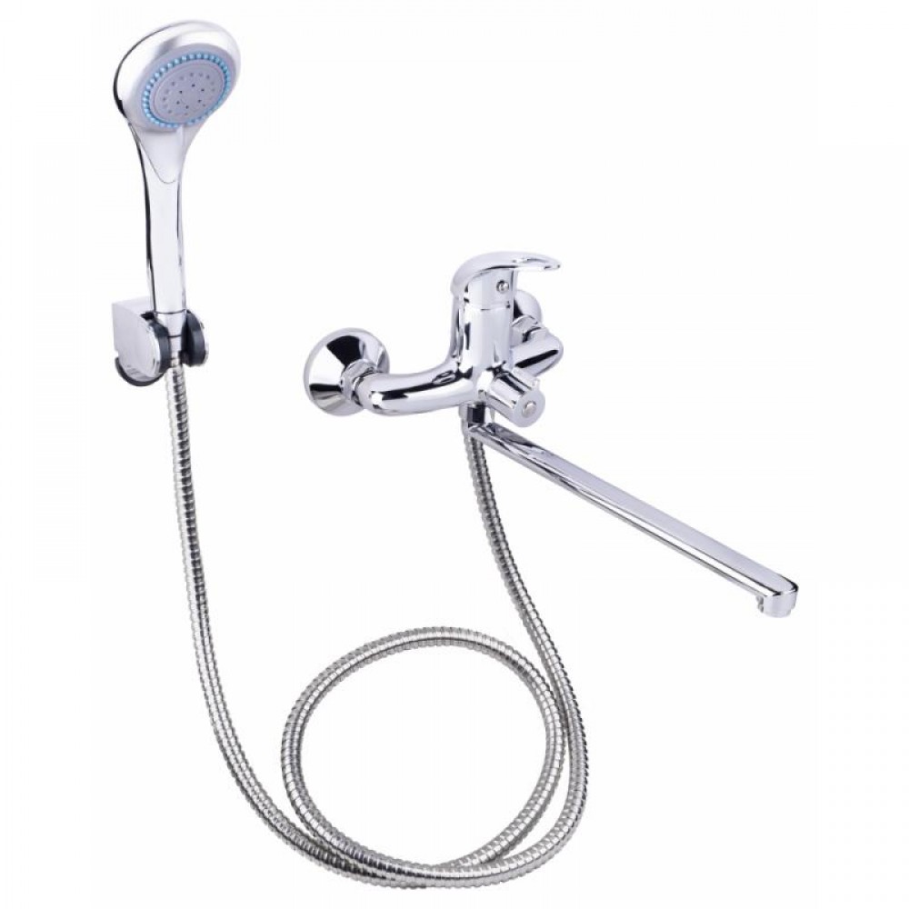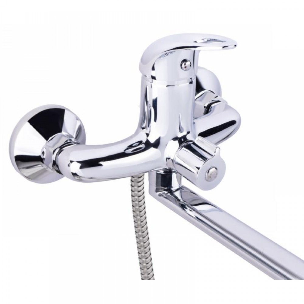 Ванный смеситель с длинным изливом Lidz (CRM) Premiera 41 005A-1 изготовлен из латуни, укомплектован кронштейном для ручного душа, душевым шлангом и лейкой. Конструкцией предусмотрен излив длиной 32 см. Благодаря хромированному покрытию имеет прочную поверхность и привлекательный внешний вид. Декоративные розетки скроют погрешности установки на отделке комнаты. Напор воды и ее температура регулируются поворотом рычага в необходимое положение. Переключение ванна/душ осуществляется при помощи дивертора.